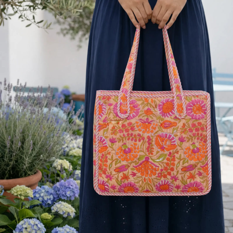 Pink Handblock Printed Big Tote Bag with Zip