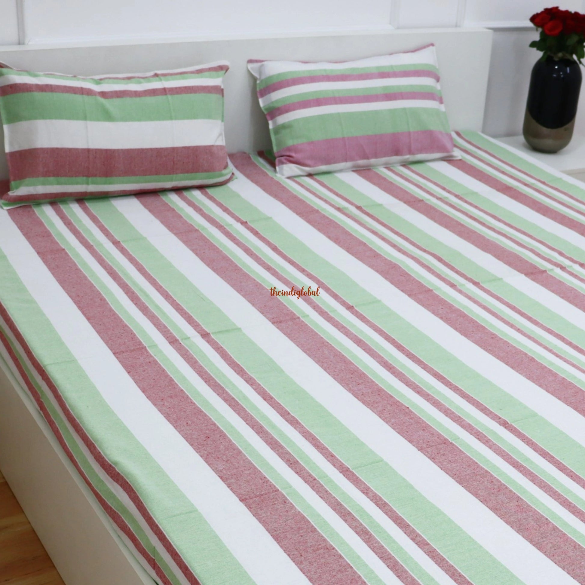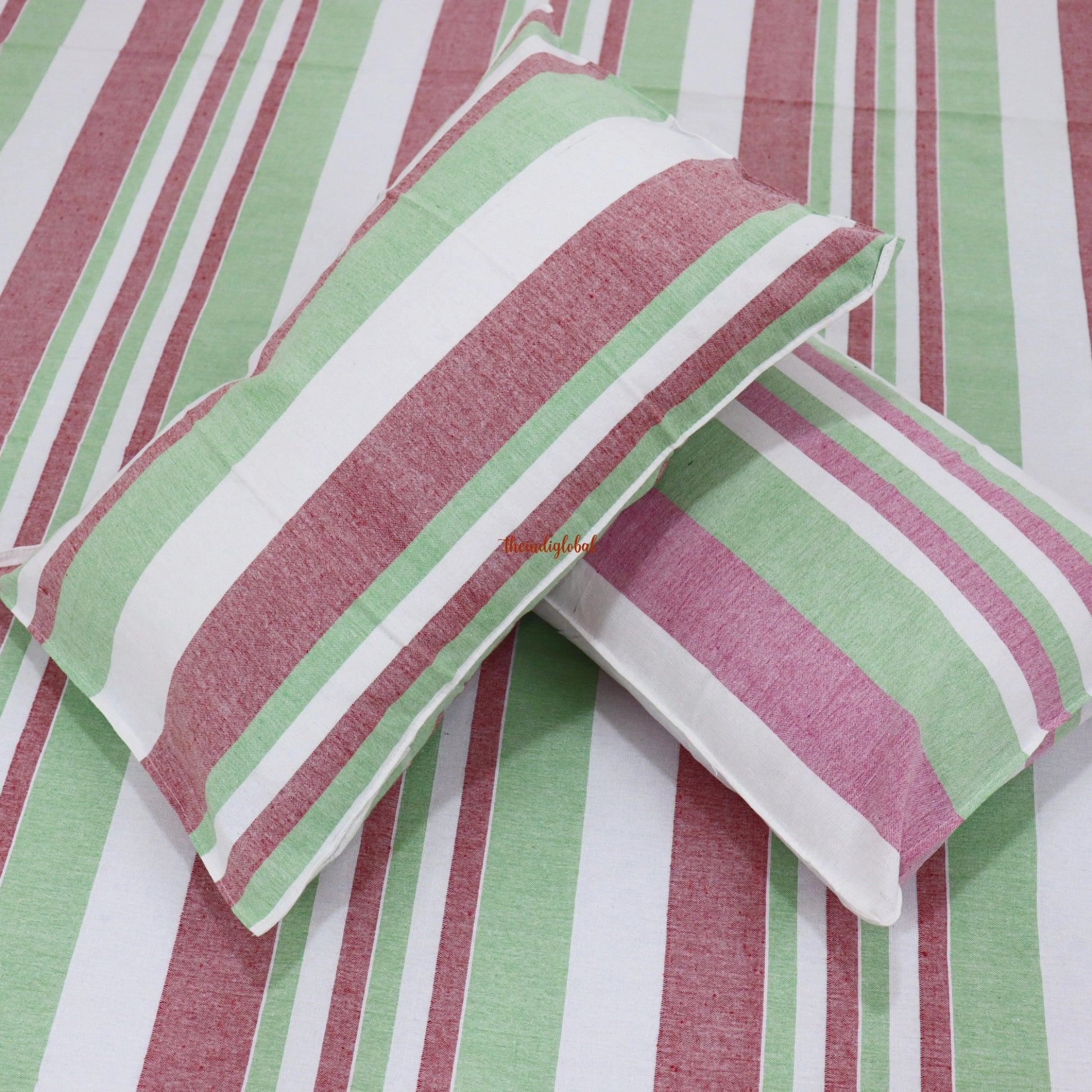Handloom Cotton Bedsheet with Pillow Covers Pink Green