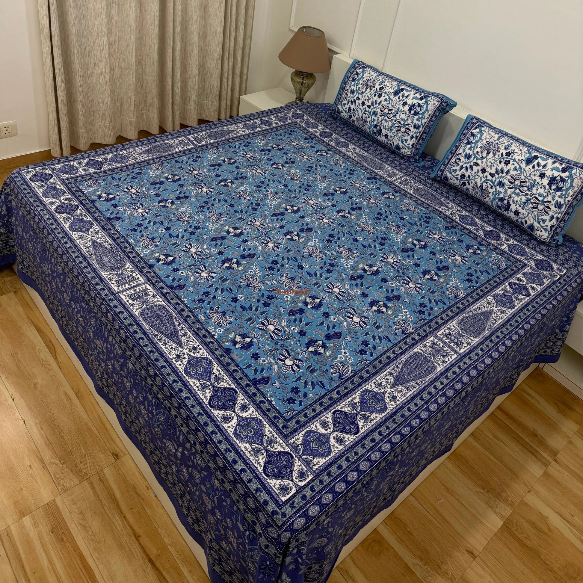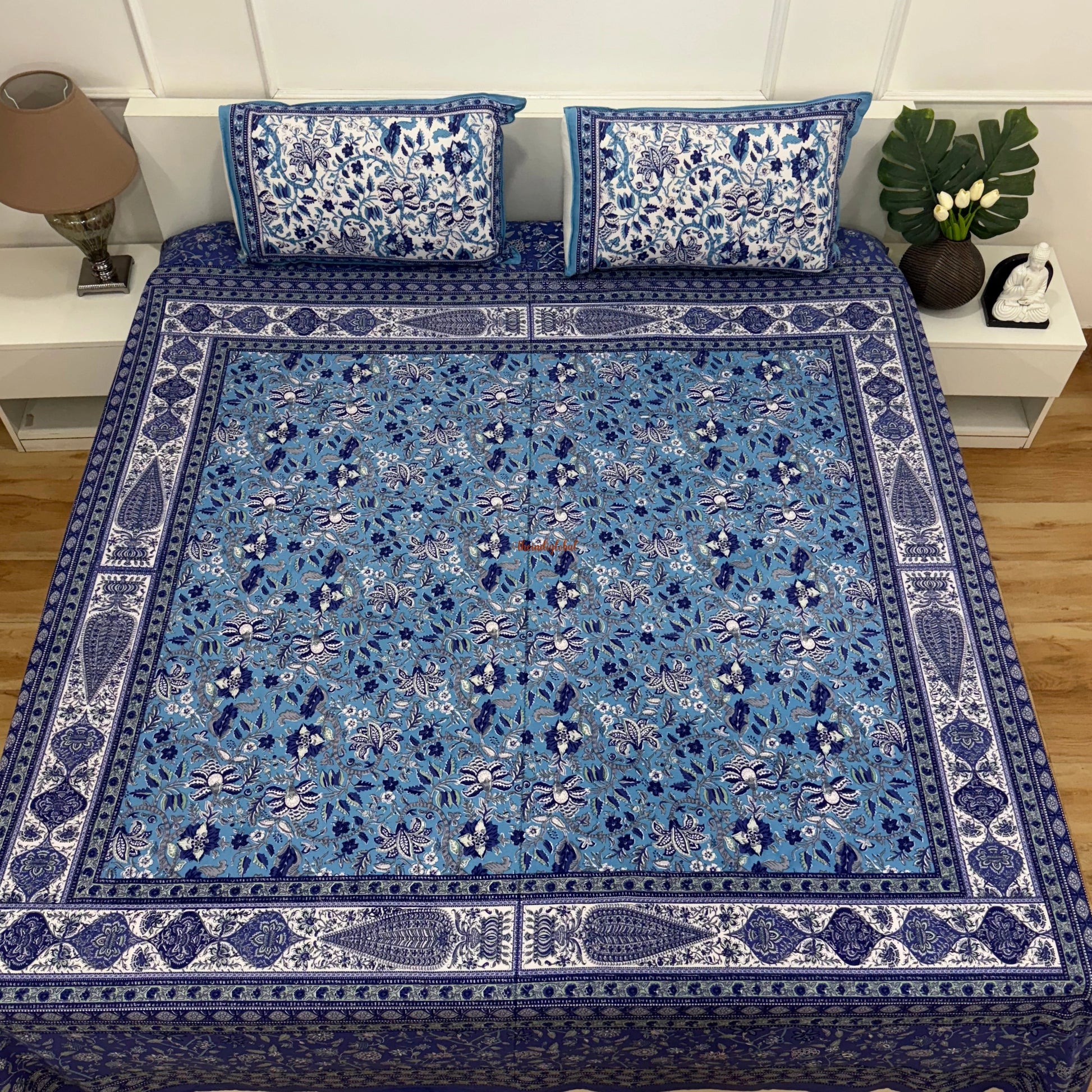 Homi Cotton Bedsheet for Super King Size Bed With Two Reversible Pillow Covers Blue