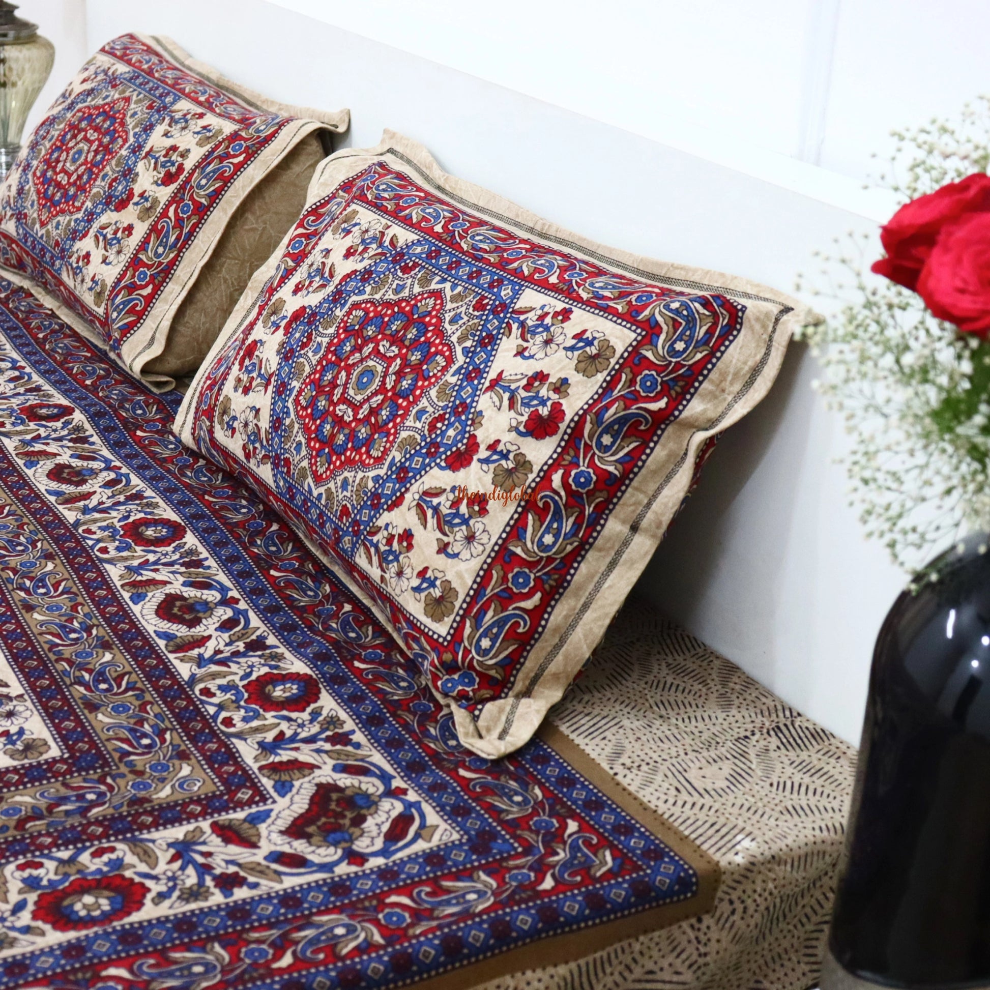 Indulge in timeless elegance with this luxurious bedsheet set, hand block printed with traditional buta motifs for a refined, heritage-inspired touch. Woven from soft, 100% cotton percale and finished with a 300 thread count, it offers a breathable, gentle feel that’s perfect for everyday sophistication. The craftsmanship shines through every precisely aligned print, balancing cultural depth with minimalist beauty.