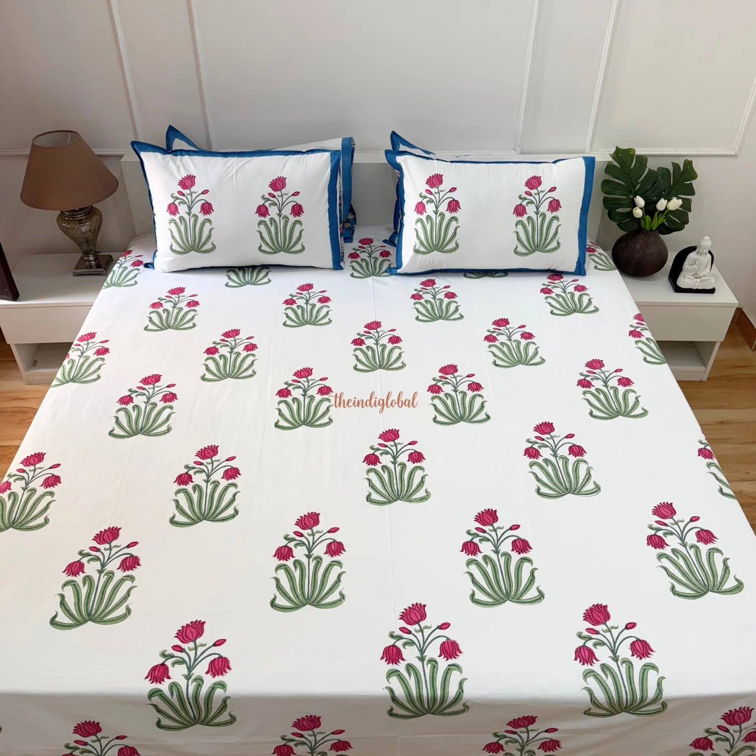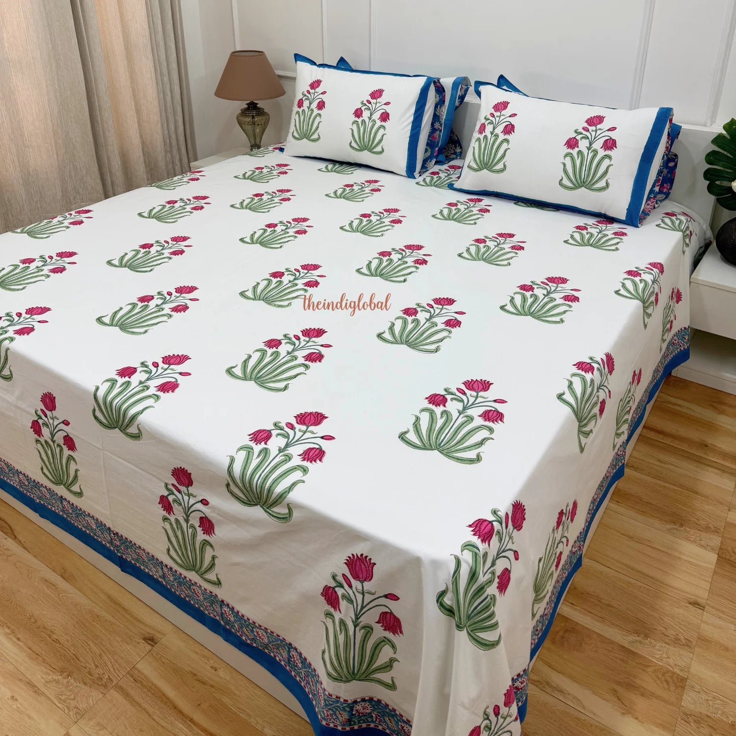 Ramya Hand Block Soft Cotton Bedsheet with 2 Pillow Covers 108*108 inches Holytulip