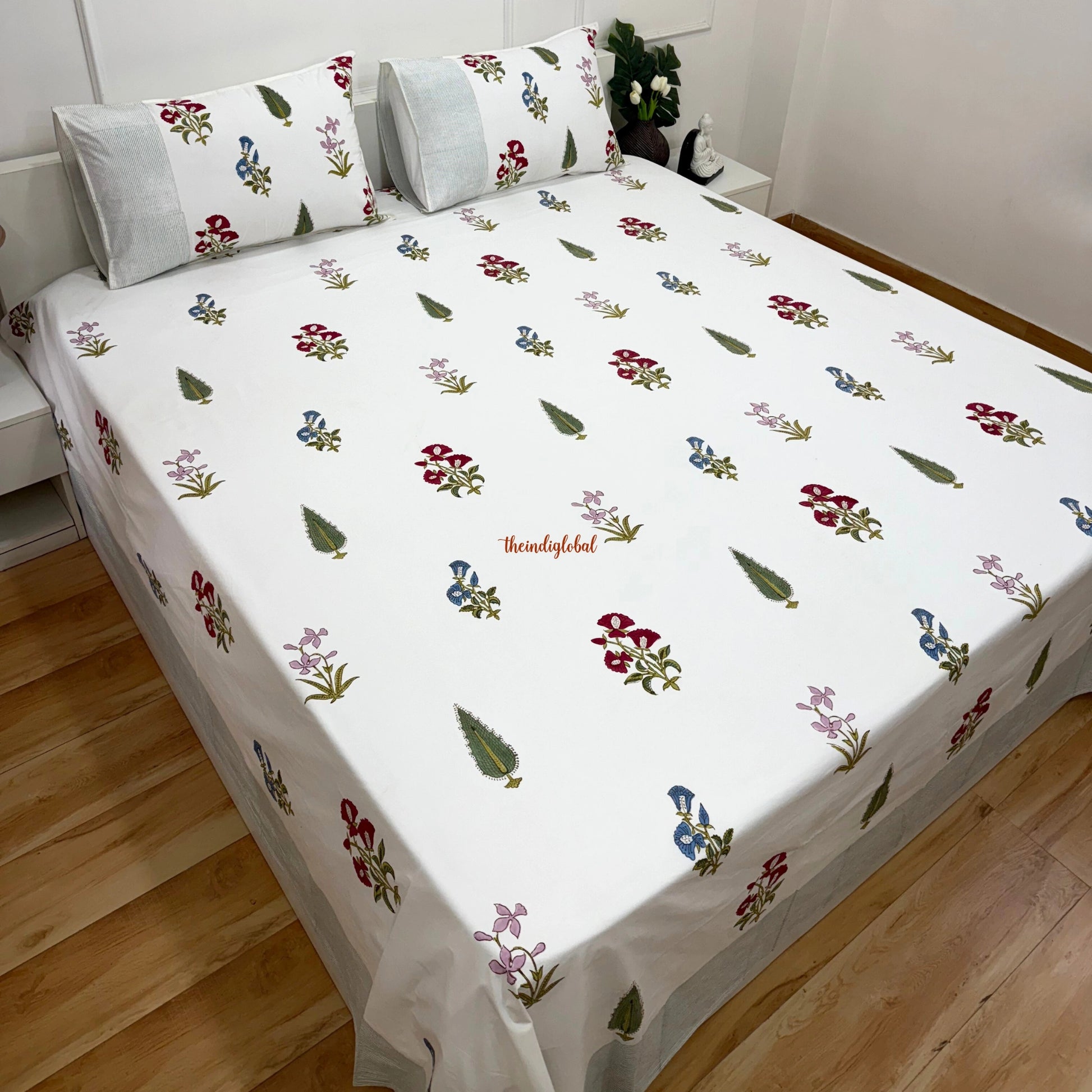 Ramya Hand Block Soft Cotton Bedsheet with 2 Pillow Covers 108*108 inches White