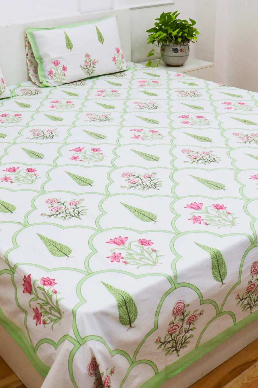 Veda Hand Block Soft Cotton Bedsheet with 2 Pillow Covers Green